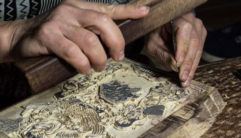 In this step, the artist carefully designs and outlines the painting, paying close attention to every detail. To carve the woodblock, they use tools called "ve" (chisels), made from hard steel. Each set of ve contains around 30-40 different pieces, each with a unique purpose to bring the artwork to life.