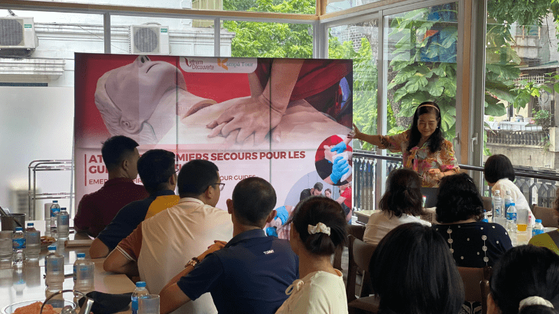 June 19, 2024 - Emergency first aid is essential, both in daily life and during travels. Each year, thousands of travelers entrust us with organizing their trips, guided across the country from mountain peaks to sea shores and from urban hustle to rural tranquillity. Aware of the importance of first aid, we organized a dedicated workshop for our tour guides. This workshop covered vital skills such as cardiopulmonary resuscitation (CPR), fracture treatment, and airway obstruction management. Participants engaged in simulations and role-playing exercises, approaching the training with seriousness. Thanks to this training, our entire team, especially our guides, is now perfectly prepared to accompany you on wonderful adventures in complete safety.
