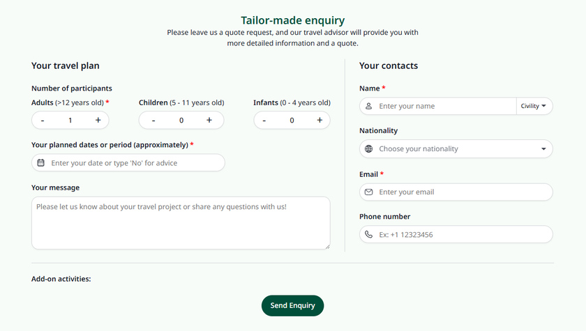 Browse our sample itineraries on the website for inspiration, or if you already have a plan in mind, simply click "Get a Free Quote".
