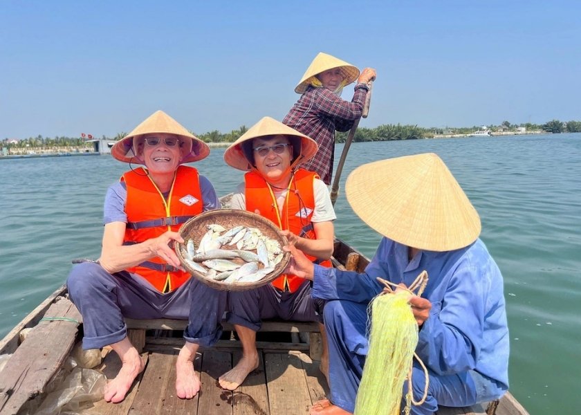 Travelers can learn the traditional skill of casting a throw net while navigating the palm canals of Cam Thanh.
