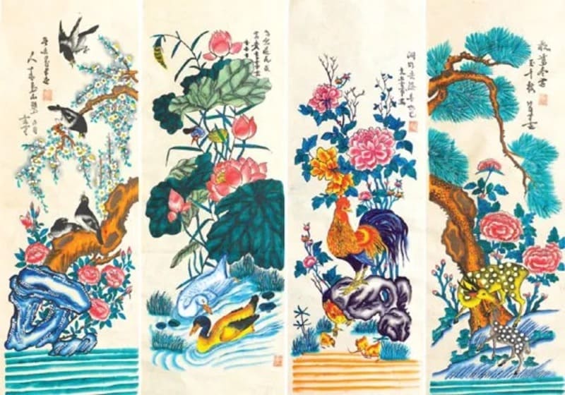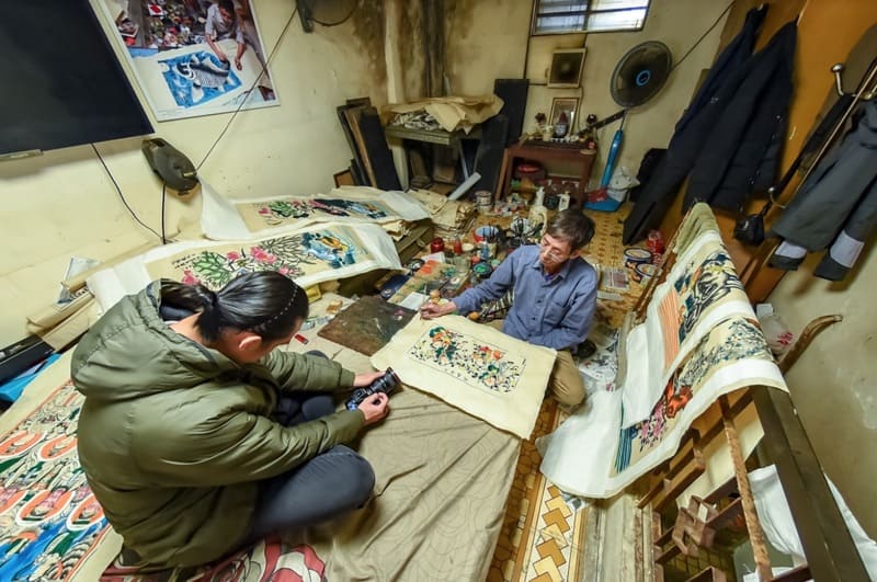 Featuring themes ranging from daily life to sacred symbols, Hang Trong paintings reflect Vietnamese faith and aesthetics. Each artwork, combining woodblock printing with hand-coloring using natural pigments, showcases the artisan’s meticulous skill and craftsmanship.