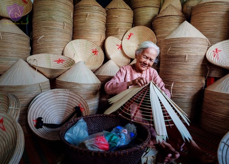Phú Cam Village in Hue is known for its poem hats (nón bài thơ), where artisans insert poems between the leaves. These hats symbolize the rich poetic tradition of Hue, and visitors can combine the trip with a visit to Dong Ba Market.