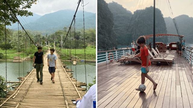 [4/01/24]: ¡Hola! Estamos de regreso del barco en la Bahía de Halong. ¡Fue realmente hermoso! No les dije que la semana pasada comimos grillos 😁 En Tam Coc los chicos jugaban al fútbol con los niños de allí 😉
