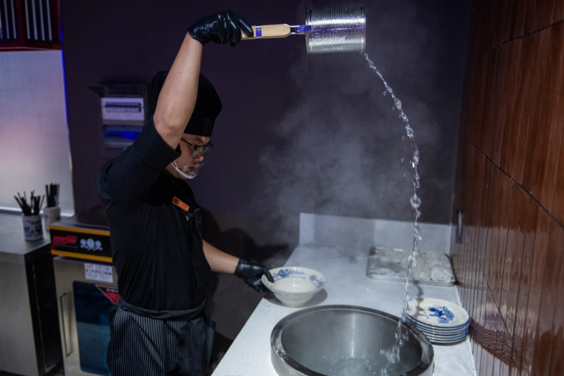 In an immersive space, surrounded by large screens, visitors enjoy a bowl of pho in an enveloping, almost cinematic atmosphere. The kitchen is fully open, allowing guests to observe every step, from serving the broth to the final presentation. The team works with gloves and follows strict hygiene standards.