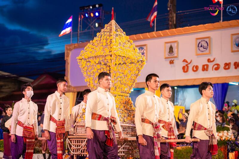 The program includes sacred rituals like the Worship Ceremony at Wat Phra Mahathat Woramahawihan, alongside traditional competitions such as tricycle racing and sepak takraw.