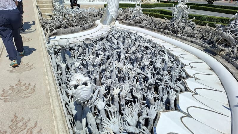 Before entering the main hall of Wat Rong Khun (the White Temple), visitors cross a narrow white bridge known as the Bridge to Paradise. On both sides, hundreds of ghostly hands reach up from below, symbolizing human desire and suffering. The passage represents leaving behind temptation and earthly attachments in order to move toward enlightenment.